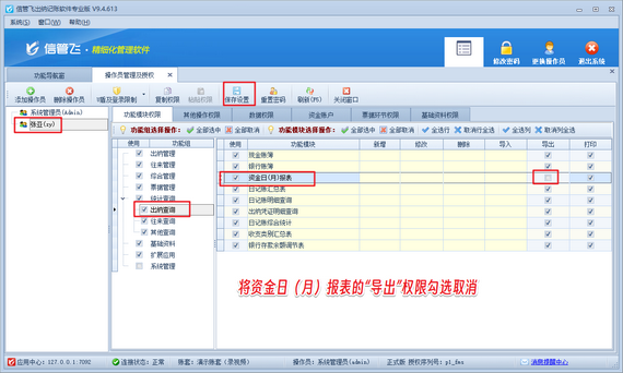 登錄軟件,在功能導航窗點擊“系統管理”—》“操作員及授權”,進入“操作員管理及授權”界面,選擇操作員賬號“張亞”,在其右側的功能模塊權限內選擇“出納查詢”,將資金日(月)報表的“導出”權限勾選取消,然后保存權限設置,如下圖所示。