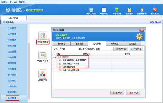 登錄自動提示預警,需要設置下參數(shù)。功能導航窗點擊“系統(tǒng)管理”,打開“系統(tǒng)參數(shù)配置”,業(yè)務參數(shù)中啟用以下參數(shù):“登錄系統(tǒng)時彈出系統(tǒng)預警窗口”、“啟用庫存上下限預警”、“啟用負庫存預警”。如下圖所示: