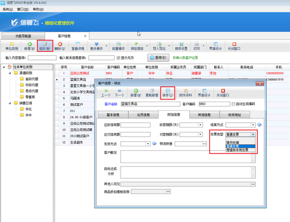該功能操作路徑簡潔直觀:用戶通過功能導航窗進入“基礎資料”模塊,點擊“客戶信息”打開客戶列表。選擇目標客戶后點擊“修改”按鈕,在客戶信息編輯界面找到“附加信息”選項卡,即可根據客戶實際需求設置默認發票類型(如圖示)。例如,可為長期合作企業“藍貓文具店”預設“普通發票”為默認選項。