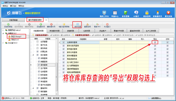 在功能導(dǎo)航窗點(diǎn)擊“系統(tǒng)管理”—》“操作員及授權(quán)”打開操作員管理及授權(quán)界面,選擇操作員賬號(hào)“張亞”,然后在其右側(cè)的功能模塊權(quán)限內(nèi)選擇“庫存查詢”,將倉庫庫存查詢的“導(dǎo)出”權(quán)限勾選上,然后保存權(quán)限設(shè)置,如下圖所示。