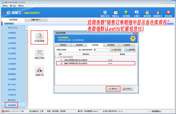 在功能導航窗點擊“系統管理”—》“系統參數配置”—》“業務參數”打開業務參數配置界面,在“用戶定制功能參數”內啟用參數“銷售訂單明細中顯示各倉庫庫存”,并設置參數值,默認是“ext15”(擴展信息15)。