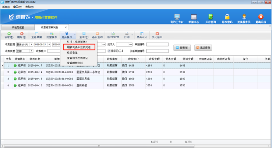 完成界面配置后,用戶只需在工具欄的“更多操作”中點擊“刷新列表中出納憑證”,系統就會自動更新列表信息。此時,那些已經轉記了出納憑證的收款結算單就會顯示憑證字和憑證號,而未轉記的則顯示為空白。