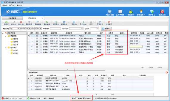 信管飛倉(cāng)庫(kù)管理軟件、信管飛送貨單軟件、信管飛RMS軟件,都支持設(shè)置多個(gè)操作員并對(duì)操作員進(jìn)行權(quán)限控制,通過(guò)設(shè)置操作員的“數(shù)據(jù)權(quán)限”,可以更精細(xì)的控制操作員對(duì)業(yè)務(wù)單據(jù)的查看權(quán)限。有用戶需要操作員只能查看本部門人員單據(jù),以“信管飛倉(cāng)庫(kù)管理軟件”為例,示范下如何操作? 示例:操作員“系統(tǒng)管理員”和操作員“張亞