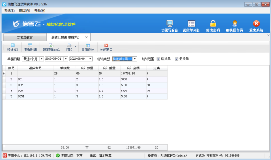 信管飛送貨單軟件為集訂單管理、送貨管理、收款結(jié)算等功能并支持送貨明細(xì)對(duì)賬及業(yè)務(wù)綜合對(duì)賬的送貨單打印軟件。軟件根據(jù)錄入的每張訂單及送貨單等數(shù)據(jù),可以自動(dòng)生成統(tǒng)計(jì)報(bào)表,完成企業(yè)銷售統(tǒng)計(jì)查詢和與客戶送貨明細(xì)對(duì)賬的目的,如下圖所示。 送貨單匯總表(按車號(hào))可以根據(jù)單據(jù)日期、統(tǒng)計(jì)類型、統(tǒng)計(jì)范圍等查詢條