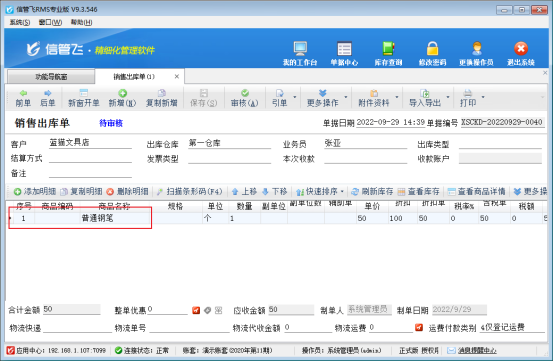 此文章相關演示視頻:如何設置新開送貨單時添加商品后自動增加新行演示視頻 信管飛RMS軟件、信管飛倉庫管理軟件、信管飛送貨單軟件等都支持開單直接添加商品明細,部分用戶在剛開始使用軟件時,開單添加一個商品后,不清楚如何在單據明細內繼續增加新的商品信息,如下圖所示,此問題在鍵盤上面按方向下鍵即可在單據明細中