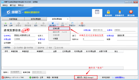此文章相關演示視頻:如何設置操作員可反審修改發票演示視頻 信管飛出納記賬軟件中支持反審發票,發票已審核后如發現填寫錯誤,可以反審修改發票,反審后,發票狀態恢復為未審核狀態,可以繼續對該發票進行修改操作,如下圖所示。 如果需要操作員反審修改發票,