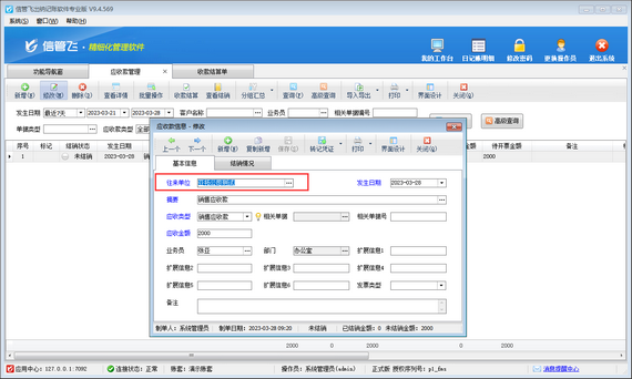 演示視頻觀看鏈接:出納軟件修改應收款信息時往來單位名稱無法修改,如何解決演示視頻 信管飛出納記賬軟件支持應收、應付賬款管理,應收、應付賬款管理是現代企業資金管理的重要組成部分,其管理效果的好壞直接影響到企業經營的成敗,有用戶在修改應收款信息時遇到無法修改往來單位名稱的情況,如下圖所示,本篇文章介紹一下遇到以上問題的解決方法。