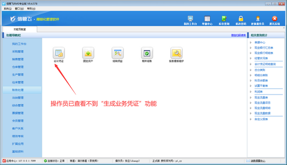 演示視頻觀看鏈接:信管飛RMS如何設(shè)置操作員不可生成業(yè)務(wù)憑證演示視頻 信管飛RMS專業(yè)版包含財務(wù)處理功能,可登記會計憑證,支持直接對已開單據(jù)進行快速生成會計憑證操作,如下圖所示。為避免操作員誤生成會計憑證,軟件支持設(shè)置操作員權(quán)限,本篇文章介紹下如何設(shè)置操作員不可使用生成業(yè)務(wù)憑證功能? &nb