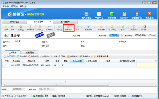 信管飛RMS軟件標準版及專業版支持擴展功能模塊。擴展生產管理模塊后,生產任務單被引用開單生產領料單,客戶咨詢領料期間發現部分庫存無貨,只能更改任務單,在更改部分領料狀態的生產任務單時提示“當前任務單已下達生產領料出庫單,不能反審修改”,如何解決?提示如下圖所示:     允許反審修改,需啟用下參數