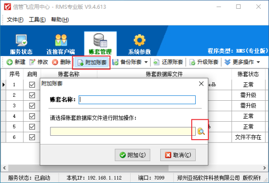 用戶使用軟件過程中,有時存在不正常退出情況,重新登錄軟件時提示“您要選擇的賬套無效或不存在”,應用中心程序打開賬套管理界面,賬套列表沒有賬套。出現此種情況需附加下賬套,我們可以通過附加賬套的方式把賬套文件進行附加進來,遇到在附加賬套界面選擇賬套文件路徑按鈕不顯示:     出現這個問題的具體原因是數據庫服務器