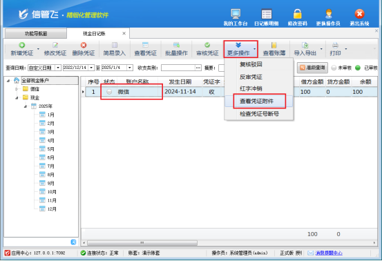 信管飛出納記賬軟件在新增或修改憑證時,允許用戶添加文檔、圖表等豐富的附件資料,支持掃描或直接導入與出納憑證相關的電子文件。這一功能極大地方便了用戶全面、直觀地回溯和查詢日記賬憑證的詳細信息,有效提升了企業對日記賬憑證的管理效率。當用戶需要在日記賬列表界面快速查看某一憑證的附件時,信管飛出納記賬軟件提供了直接在列表中打開附件資料的便捷功能。本文以“信