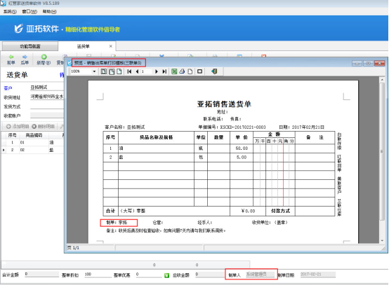 紅管家送貨單軟件、亞拓管理軟件、紅管家倉(cāng)庫(kù)管理軟件都支持開(kāi)單打印送貨單(銷售單),打印模板中的制單人,默認(rèn)是當(dāng)前登錄軟件的操作員,有的客戶需要打印模板統(tǒng)一為一個(gè)制單人,就需要在打印模板中固定制單人名字。 以送貨單軟件為例,示范如何在打印模板中直接固定制單人名字,選擇一個(gè)送貨單單據(jù),選擇“打印”—》“打