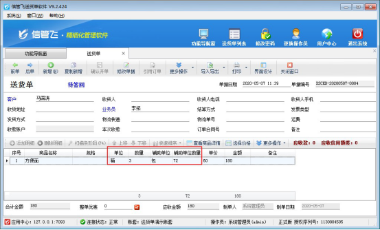 信管飛送貨單軟件、信管飛RMS標準版、專業版軟件支持多計量單位,可添加輔助單位,那什么是輔助單位呢?有的商品在銷售中可能按“包”,也可能是按“箱”進行銷售,存在多個不同的計量單位,此時在軟件中此商品就需要用到輔助單位,輔助單位,就是同一個商品存在多個不同的計量單位,這幾個單位之間存在一定的換算關系,不管是輸入哪一個單位,軟件都可以根據換算比例來自動