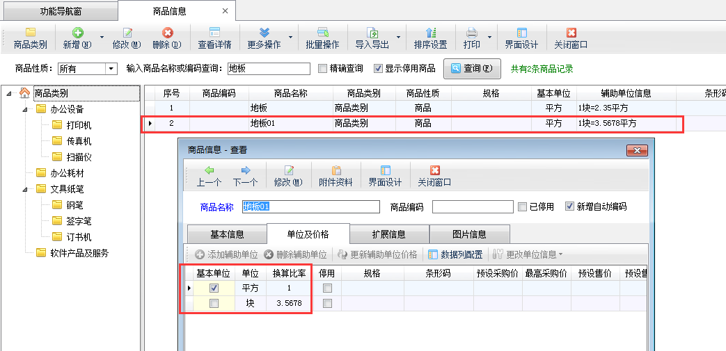 進銷存軟件中支持多計量單位,可以添加商品輔助單位,即同一個商品存在多個不同的計量單位,這幾個單位之間存在一定的換算關系,開單時不管輸入哪一個單位,軟件都可以根據換算比例來自動進行換算轉換。輔助單位信息內顯示多單位換算關系,默認保留兩位小數顯示(如下圖所示),如需設置保留多個小數位顯示,系統也支持通過參數配置進行設置,本文介紹一下如何設置商品單位換算比率小數顯示