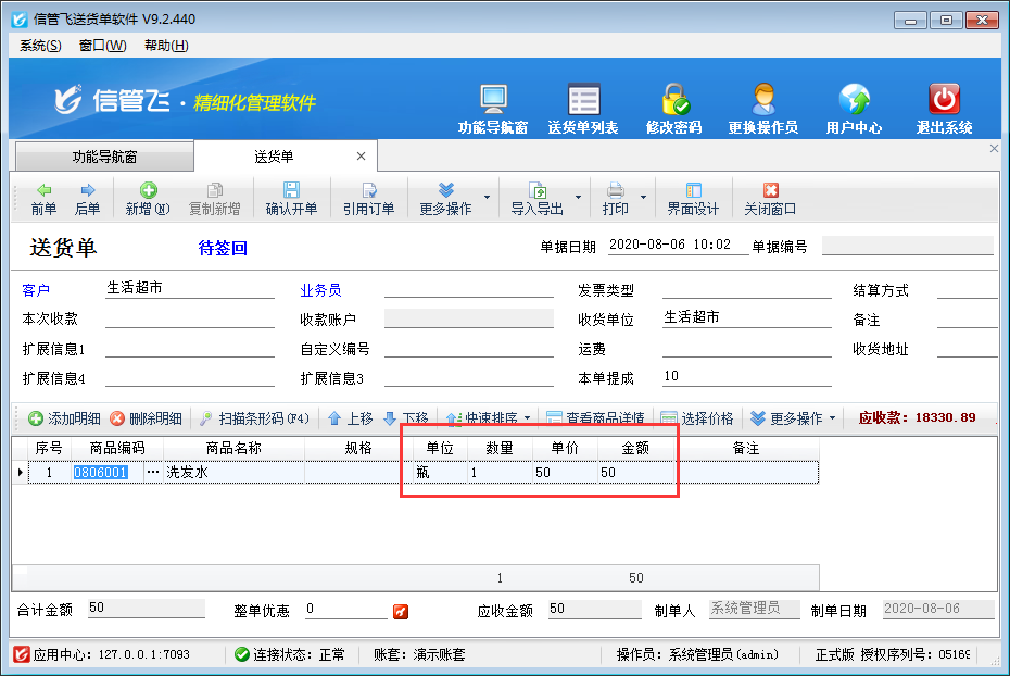 信管飛RMS、信管飛送貨單軟件等都支持開單前錄入好商品的預設價格,如預設采購價、預設售價等,方便開單選擇商品時自動獲取價格信息。如下圖所示,設置商品“洗發水”預設售價50元/瓶,以送貨單軟件為例示范一下如何設置新開送貨單時可自動取商品預設售價。    軟件支持價格優先級設置,啟用價格優先級后軟件可以自動調取我們設定的價格,可以幫助