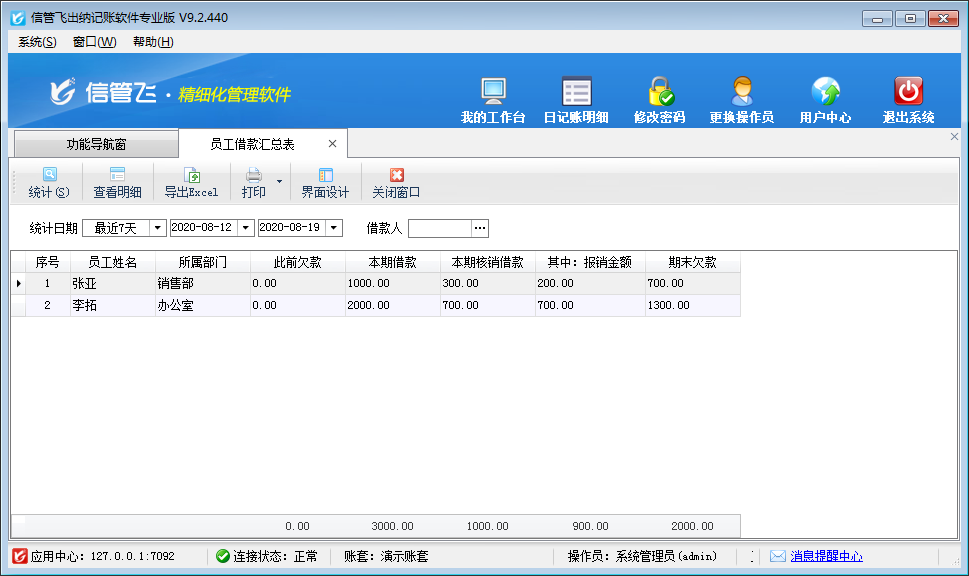 出納記賬軟件專業(yè)版的員工借款管理及還款管理功能可以對(duì)企業(yè)員工借款、還款進(jìn)行流程化登記管理,提高了企業(yè)管理效率。員工借款匯總表可根據(jù)統(tǒng)計(jì)日期、借款人等條件來(lái)進(jìn)行統(tǒng)計(jì)每個(gè)員工的借款及核銷情況,包括員工的此前欠款、本期借款、本期核銷金額及期末欠款等信息,本文詳細(xì)介紹一下如何查詢員工借款及核銷情況? 在功能導(dǎo)航窗點(diǎn)擊“綜合管理”—》