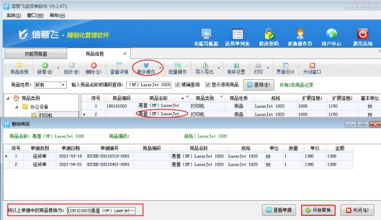 “替換商品(業務單據)”顧名思義指可以把業務單據中的該商品批量替換為另外一個商品。軟件中替換商品功能一般作用于以下兩種情況:①開單選擇錯商品,可直接在商品信息中替換為正確的商品;②存在已開單重復的商品無法刪除。本文以第二種情況進行示范。 信管飛送貨單軟件、信管飛RMS軟件都支持維護商品信息,軟件默認刪