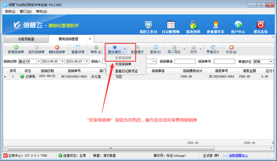 在日常工作中,因為臨時事件的發生,員工經常會自己墊付工作所需要的各項費用。這些費用在月末時,可以填寫費用報銷單進行統一的報銷。信管飛出納記賬軟件專業版有費用報銷管理功能,可以管理費用報銷單。 費用報銷單保存審核后默認不允許直接修改,但是部分客戶需要對已審核的費用報銷單進行修改,軟件支持反審費用報銷單功能,如下圖所示。本篇文章