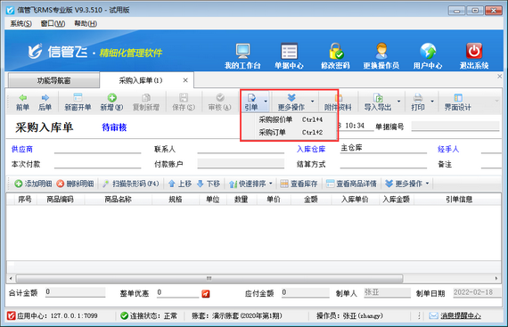 信管飛RMS(進銷存管理軟件)支持根據銷售訂單進行采購入庫進貨(如下圖所示),同時也支持配置操作員采購入庫單引用銷售訂單開單權限,本篇文章介紹一下進銷存管理軟件內如何設置操作員開采購入庫單不可引用銷售訂單? 在功能導航窗點“系統管理”—》“操作員及授權”即可進入“操作員管理及授權”界面,選中操作員賬號,在“其他操作權限”界面